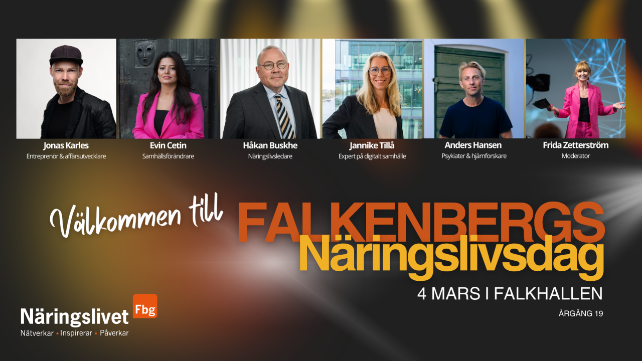 Välkommen till Falkenbergs Näringslivsdag 2026 som i år går under temat Mod att skapa förändring. En dag som gästas av ca 1000 personer och som kännetecknas av stort engagemang, tillsammansskap och mycket inspiration både från det lokala näringslivet och kommunen, men också från några av Sveriges bästa och mest intressanta föredragshållare.
